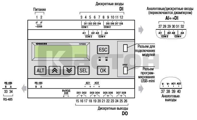 Технические характеристики ПР200-220.24.1.0 (230VAC, 8xDI(24), 4xAI, 8xDO(Р), 2xAO(У), 1xRS-485, HMI)