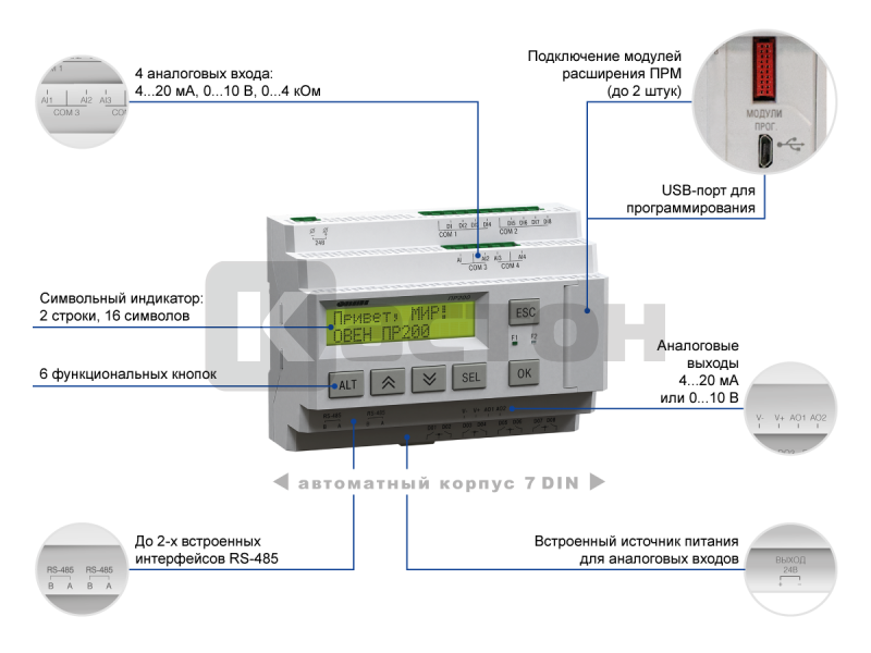 Прибор выпускается в корпусе 7 DIN и имеет на борту до 24 каналов ввода/вывода. Для расширения собственных входов/выходов предусмотрено подключение по внутренней шине модулей расширения ПРМ. Для интеграции в SCADA-системы и управления внешними устройствами в прибор может быть установлено до двух интерфейсов RS-485 с поддержкой протоколов Modbus RTU/ASCII. Написание алгоритма осуществляется пользователем на языке FBD с помощью бесплатной среды программирования OwenLogic. Загрузка алгоритма производится с помощью кабеля miniUSB (входит в комплект поставки).